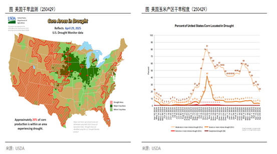 美国干旱监测显示,截至4月29日,美国玉米产区干旱区域(D1+)约20%,严重干旱及以上区域(D2+)3%、极端干旱及以上区域D3+区域为0%,与前一周对比,D1+减少6个百分点,D2+减少1个百分点,D3+持平,总体来说干旱情况好转;和去年同期对比,D1+区域增加1%,D2+区域减少5%,D3+区域一样,干旱区域与去年同期接近,不过严重干旱区域少于去年同期。