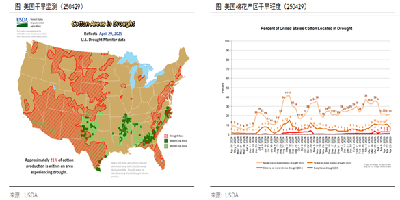 美国干旱监测显示,截至4月29日,美国棉花产区干旱区域(D1)约21%,严重干旱及以上区域(D2+)7%、极端干旱及以上区域D3+区域为3%,与前一周对比,D1+维持,D2+减少4个百分点,D3+持平,总体来说严重干旱区域减少;和去年同期对比,D1+区域增加12%,D2+区域增加5%,D3+区域增加3%,棉花产区干旱情况比去年同期严重。