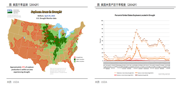 美国干旱监测显示,截至4月29日,美国大豆产区干旱区域(以下简称:D1+)大豆产区约15%区域处于干旱状态,严重干旱及以上区域(以下简称:D2+)2%,极端干旱及以上区域(以下简称:D3+)为0%,与前一周对比,D1减少6个百分点,D2+和D3+持平,总体来说干旱情况好转;和去年同期对比,D1+区域减少1%,D2+区域减少4%,D3+区域一样,状况好于去年同期。气象预报显示,5月11日-5月15日,大豆主产区气温高于正常值,降水量正常或低于正常水平,干旱情况可能有所增加。