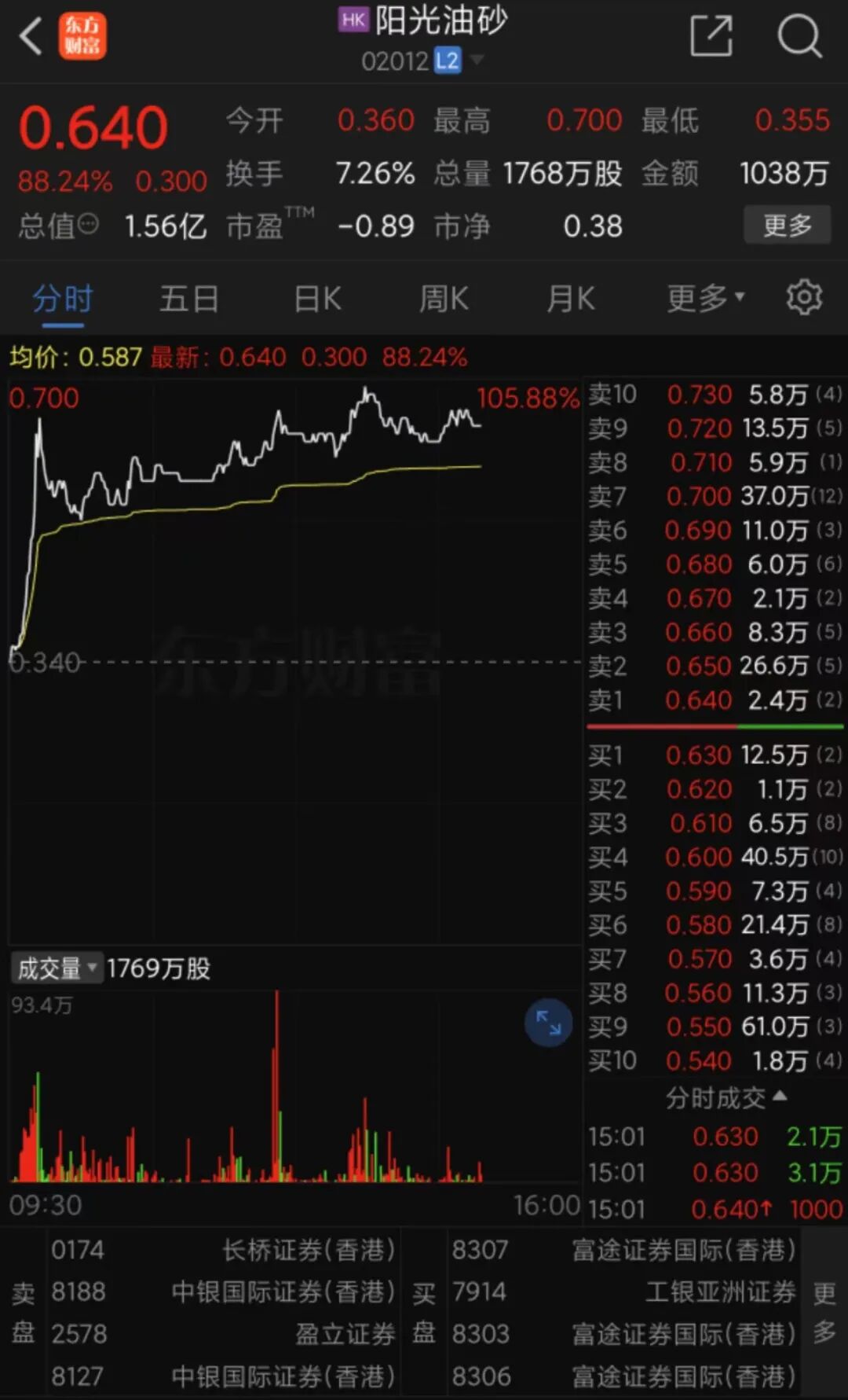 6月3日午间(13时50分),阳光油砂股价暴涨97%至0.67港元/股,成交量快速放大至1465万手。而前一个交易日,5月31日,该公司成交量还仅为197万手,成交金额为63.18万港元。