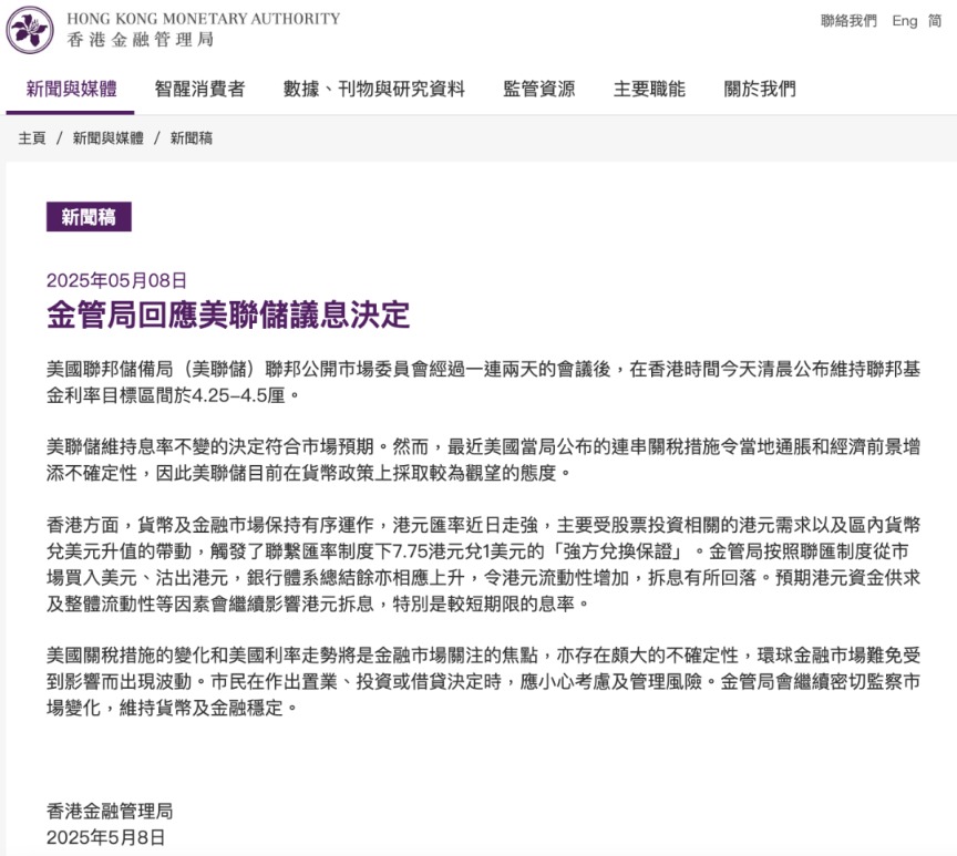 当地时间5月7日,美国联邦储备委员会结束为期两天的货币政策会议,宣布将联邦基金利率目标区间维持在4.25%至4.5%之间不变。5月8日,香港金管局回应美联储议息决定。